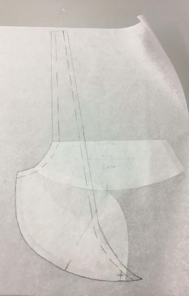 You’ll need a partial band bra pattern that fits you. Yes, you could use the London bra with a full band, but this Valentine bra looks SO much better with a partial band. A sling is a sling, whether it is used on a full band or a partial band bra. You could use the Linda bra pattern, or the Frieda. Align the upper and lower as you would for a sling, then draw in the sling and continue the line up the length of the front strap. The tip of the sling goes to the cross cup seam so the bridge can attach there as well. Cut 4 of those.