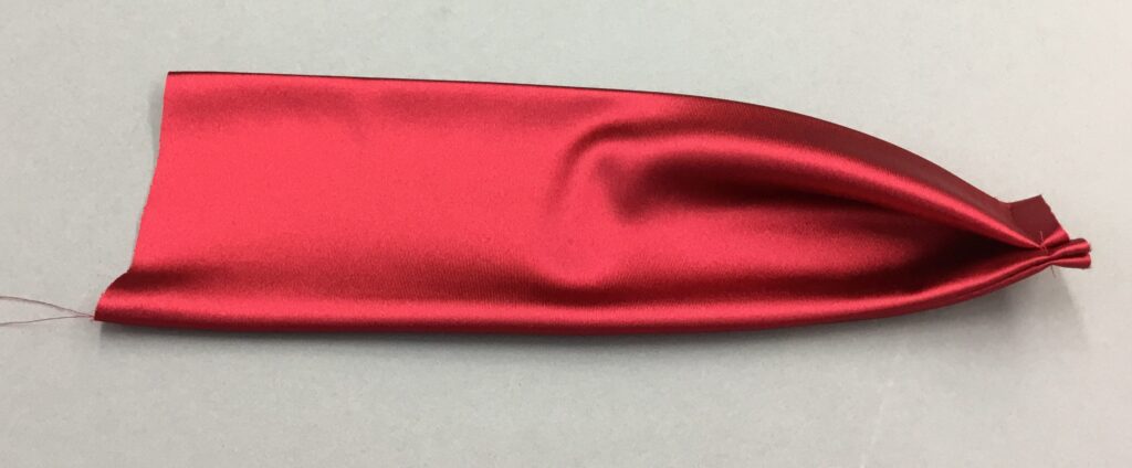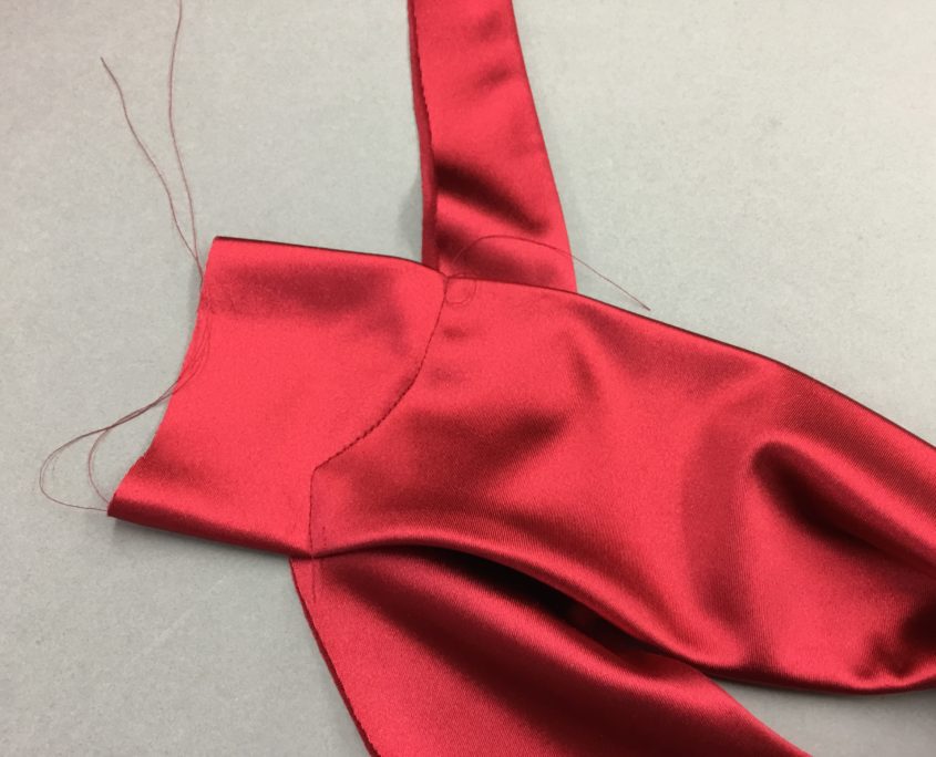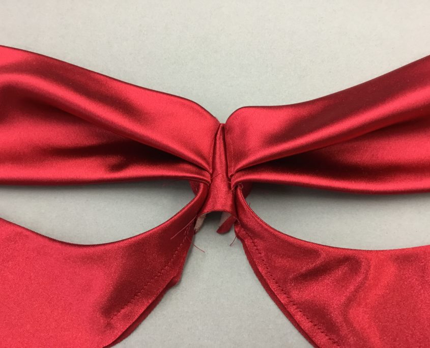 What you cannot see is how the Valentine bra wire sews on once it leaves the sling area. Is the bow simply tied on? Or is the upper cup actually sewn in place and the bow a clever add-on? The bow is not just tied on. With two layers of satin, there is no way the bow knot would be that small (I tried it!)  In reality, the sling and the hiden upper cup work together to hold the breast up. The bow is just icing on the cake! Let’s get started!