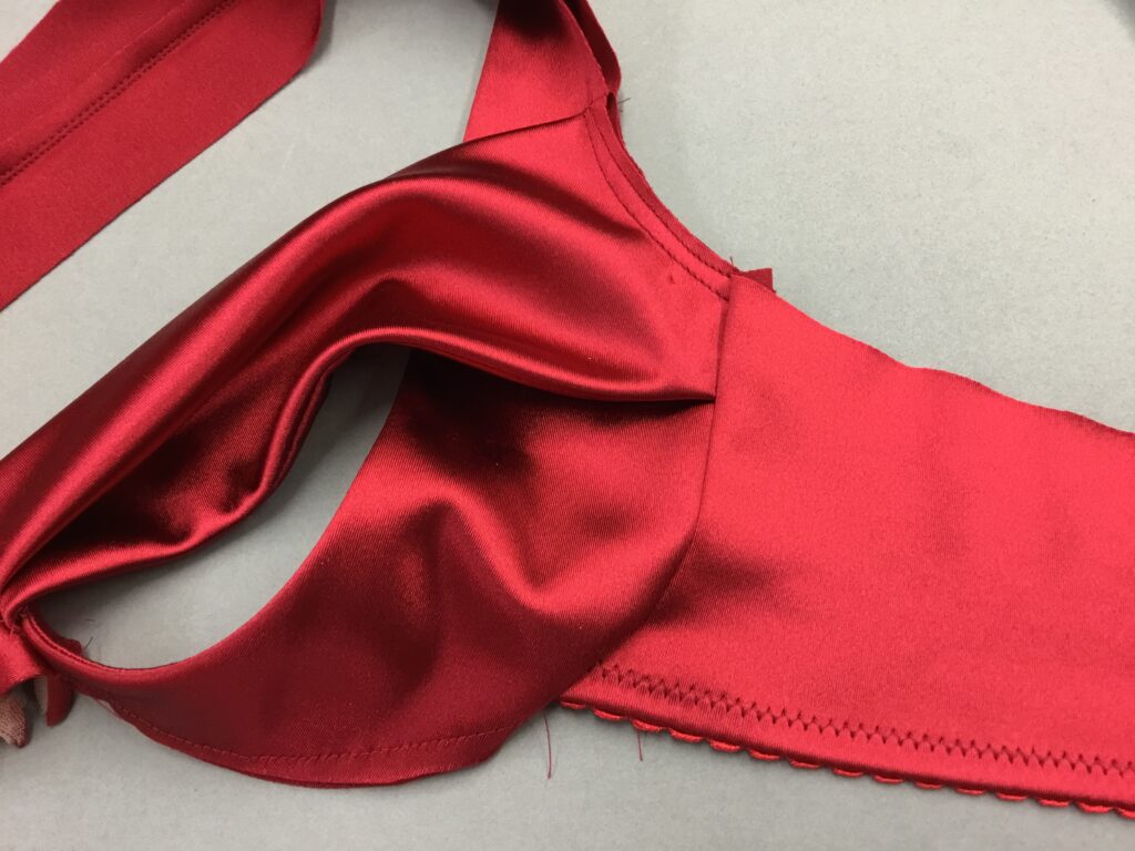 Sewing the pleated upper cup to the tiny bridge was tricky. There just wasn’t enough space to stitch with all that bulk. Hence my thoughts on reducing bulk above. But I did it!