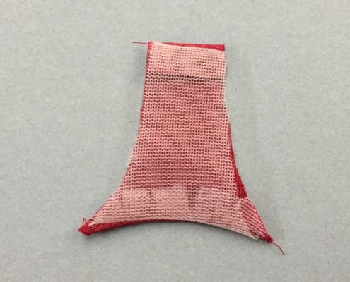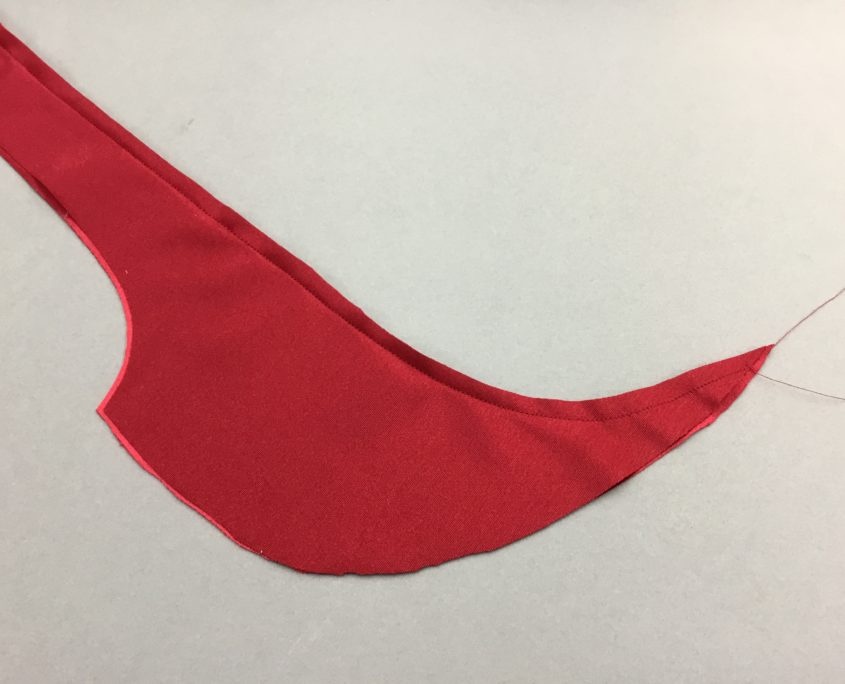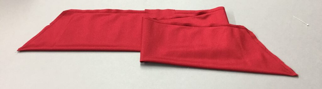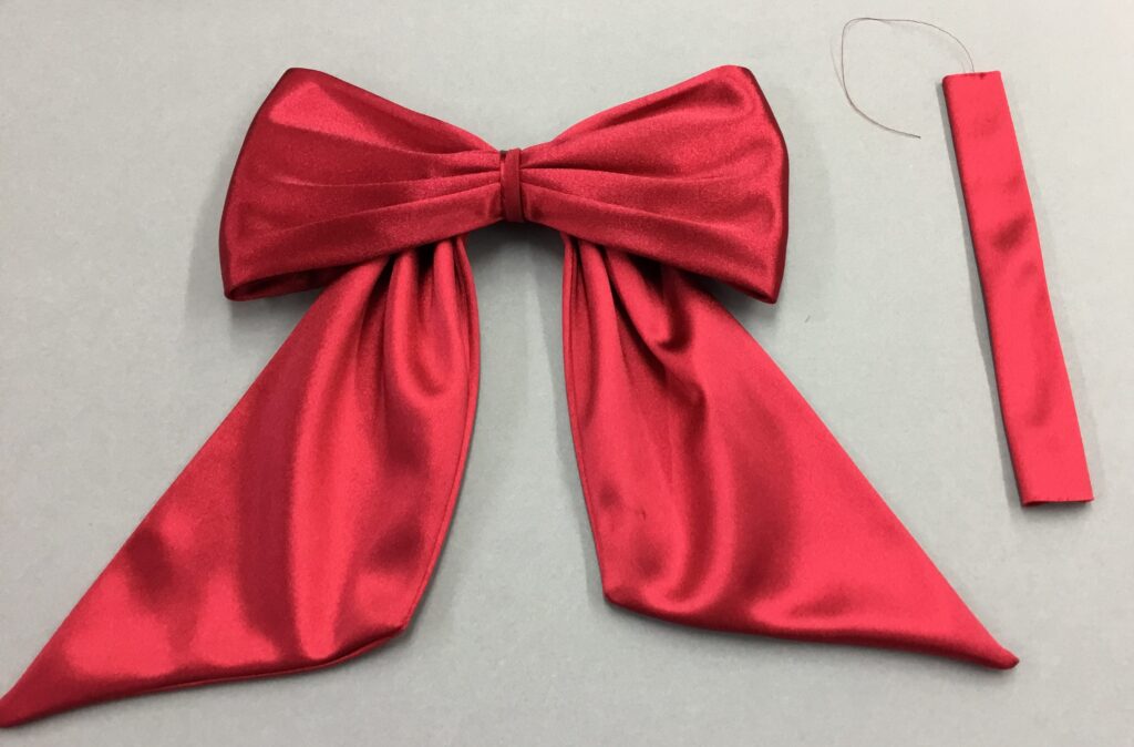 The bow is a piece of fabric 8.5″ wide and 30″ long with angled ends. Sew the open edges of the bow, leaving a small space unsewn so you can turn it.