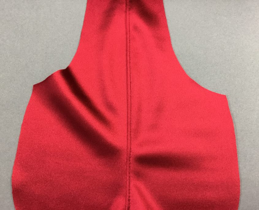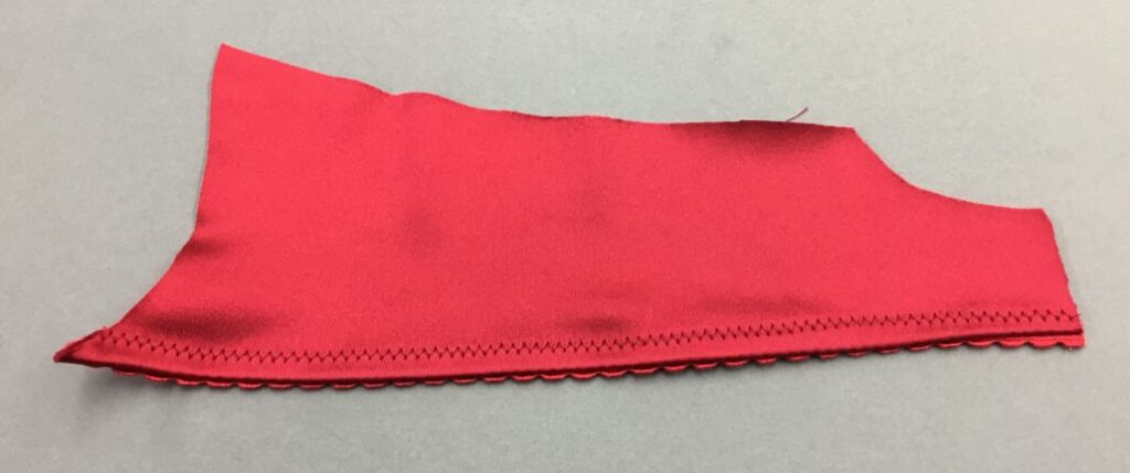 The sew the upper cup bottom edge using a zig-zag stitch so it can stretch across the breast without popping. This is a 1.5 x 1.5 ZZ. Turn and press. I will cut the underarm curve to the right shape later.