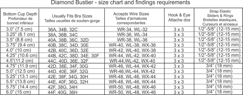 The sizing for the Diamond Bustier is a bit different from other bra patterns, in that we use the Bottom Cup Depth (BCD) to determine the size of the cup. This is the measurement from the wire line at the base of the cup up to the location of the apex. It is much more accurate than relying on ready-to-wear bra sizing, which can differ from company to company. Determine your BCD by measuring your best-fitting bra between these two points. All cup sizes from 3.0 to 6.0 are included in the pattern. Combine these 13 cup depths with 1 of 8 band sizes from 26″ (65 cm) through 40″ (100 cm) to make the Diamond Foam Lined Bustier size range equivalent to over 100 unique bra sizes.