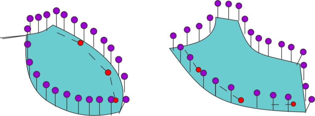 • Sometimes, a piece like the upper cup cannot be flattened to the board because too many other pieces are sewn to it. To pin such a piece, you will need to pin as much as you can, then unpin the beginning the end to the center pins to free up the fabric, keeping the pins set at the apex and above the apex to mark your spot. This unpinning allows the upper cup to pivot around so it can be pinned again until the piece is finished.