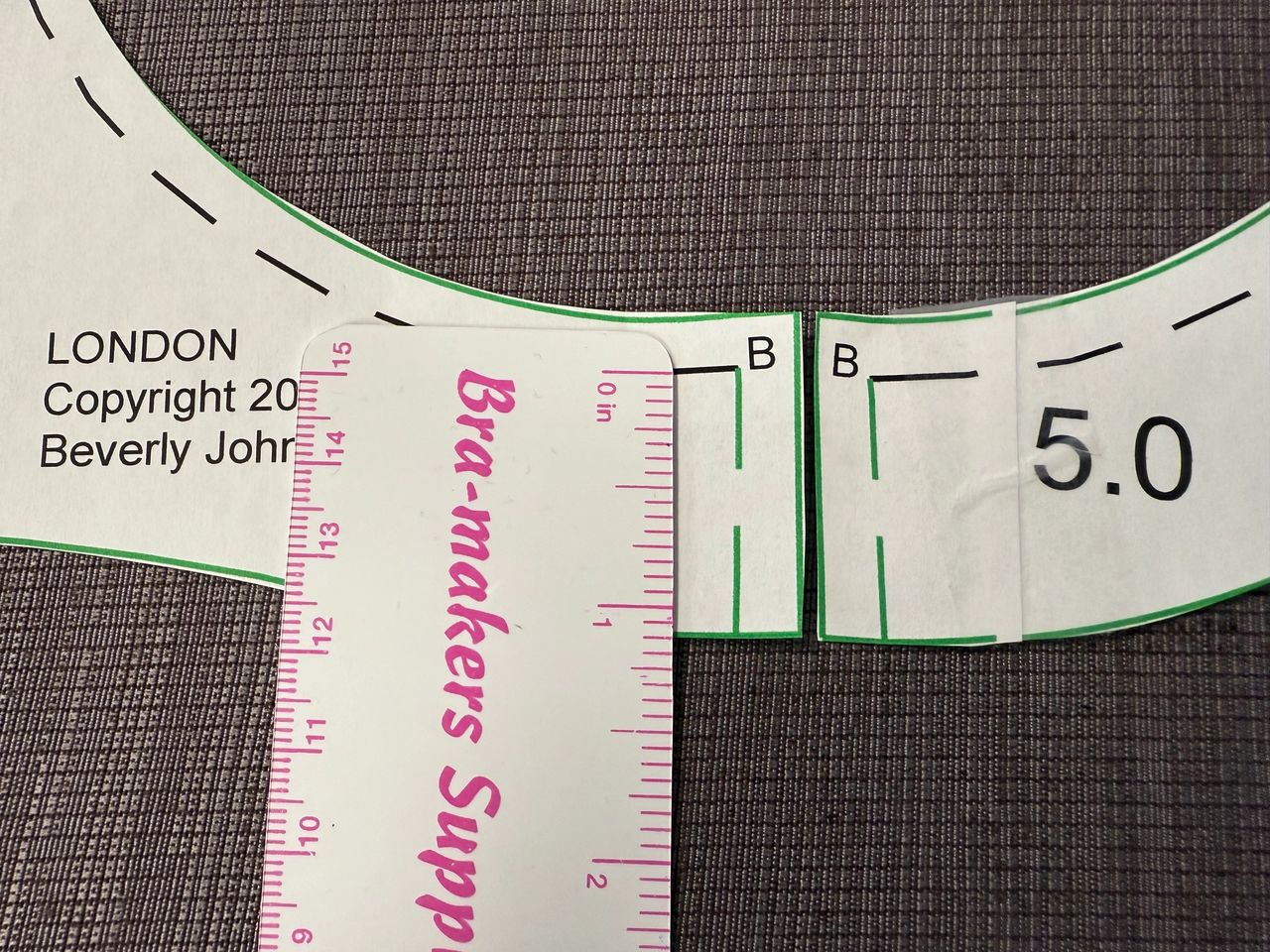 If you are using “3/4″-wide elastic, you normally would allow 1.5″ for that bottom band width. However…I find that a wide elastic tends to roll up a bit, especially if you have a high tummy. What I have done with 3/4″ elastic is to make the bottom band 1/2″ plus 3/4″ for the elastic allowance, so 1.25″ total. Then, after sewing the first pass of the elastic, I turn the elastic up to see how much I need to trim off (in the bottom curve only) to have the elastic avoid the wire line stitching and yet still be covered once the channeling is applied. That should not be more than 1/4” and only for a couple of inches (at most) along each side of the B notch. I mark it with a washout marker so I do not trim off too much. The channeling will completely cover the cut edge of the elastic and will allow you to get a nice, thin band.