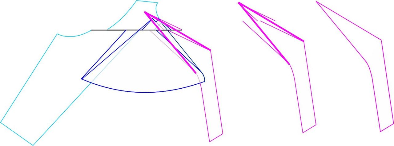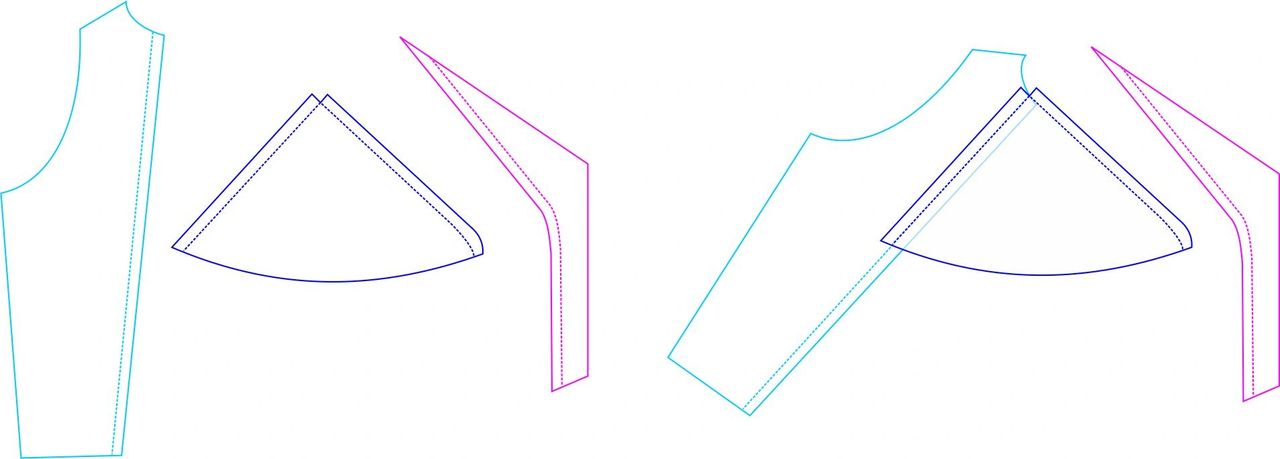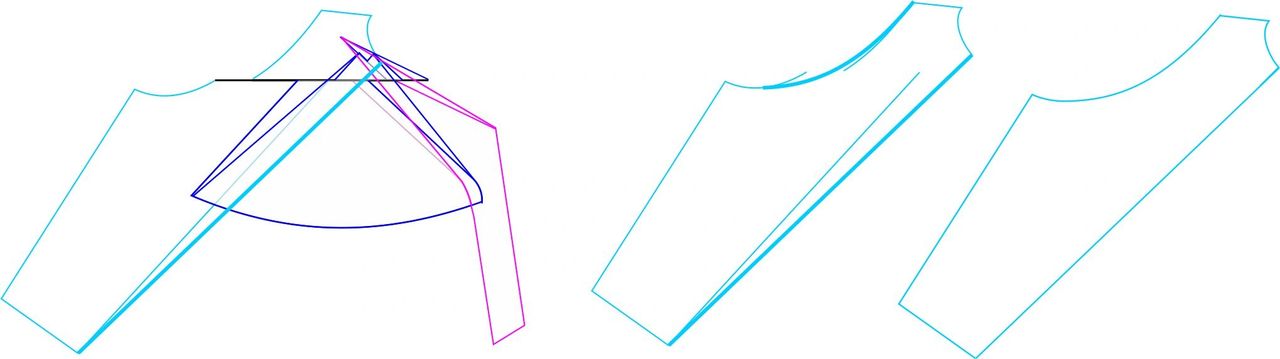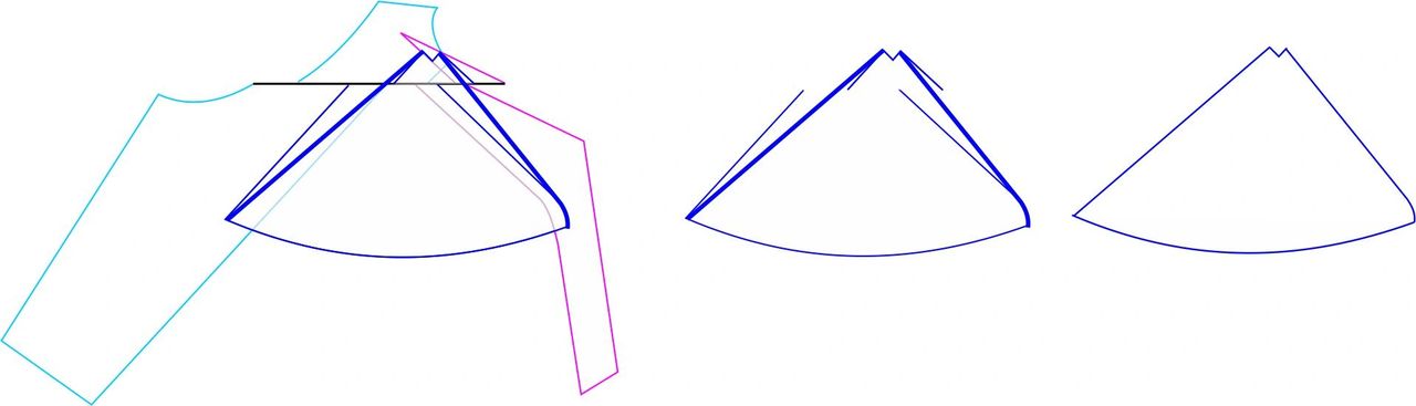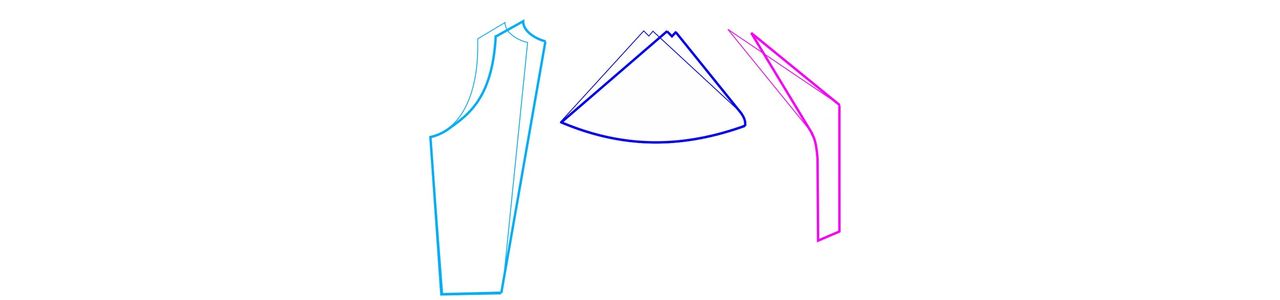 Here are the new pattern pieces compared to the original. The modified piece is the bold line. You can see how the top of the pattern piece has shifted 5/8″ (15 mm) to the right, while the bottom of the piece did not move.