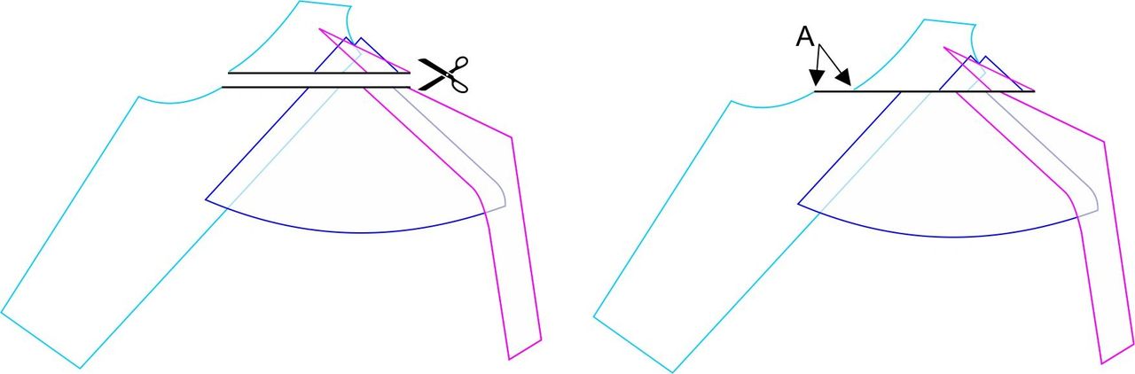 Drawing at right below: Slide the upper section along the line the desired amount toward the centre front. I want to move the strap by 5/8″ (15 mm). The pattern was drafted as the right-hand side of the body, so that means I’ll be sliding the upper section to the right by 5/8″ (1.5 cm). Slide it over by that amount (A). Tape the two sections together again. At this point, it probably looks like a jumbled mess of lines.