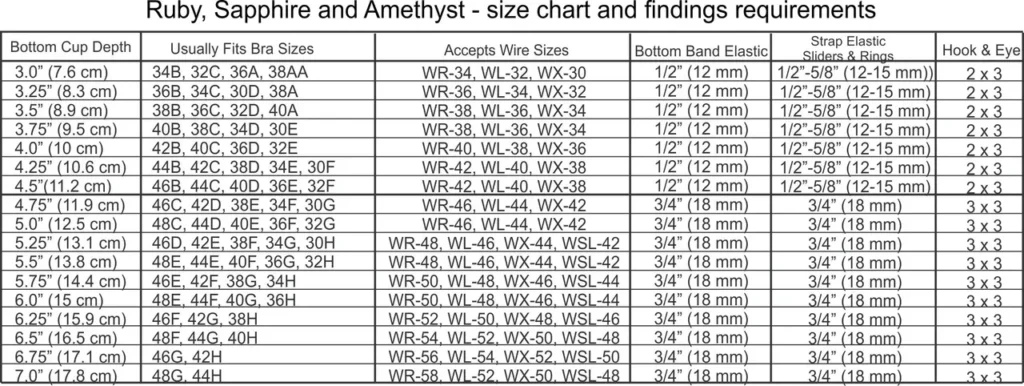 The sizing for the Sapphire is a bit different from other bra patterns, in that we use the Bottom Cup Depth (BCD) to determine the size of the cup. This is the measurement from the wireline at the base of the cup up to the location of the apex. It is much more accurate than relying on ready-to-wear bra sizing, which can differ from company to company. Determine your BCD by measuring your best-fitting bra between these two points. All cup sizes from 3.0 to 7.0 are included in the pattern. Combine these 17 cup depths with 1 of 8 band sizes from 26″ (65 cm) through 40″ (100 cm) to make the Ruby Full Band Bra Pattern size range equivalent to over 120 unique bra sizes.