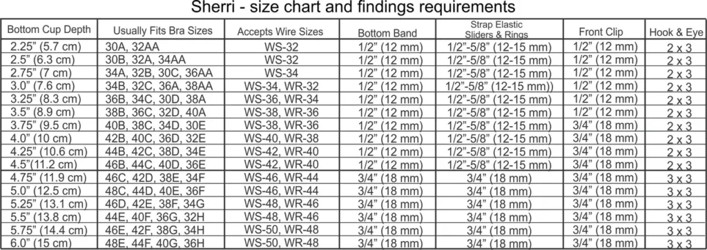 This pattern uses a unique sizing system called the Bottom Cup Depth Sizing Method (BCD).  All BCD sizes from 2.25 through 6.0 are included in this one pattern, which offers the equivalent of over 100 ready-to-wear sizes. This includes the “in-between” sizes that ready-to-wear does not carry!