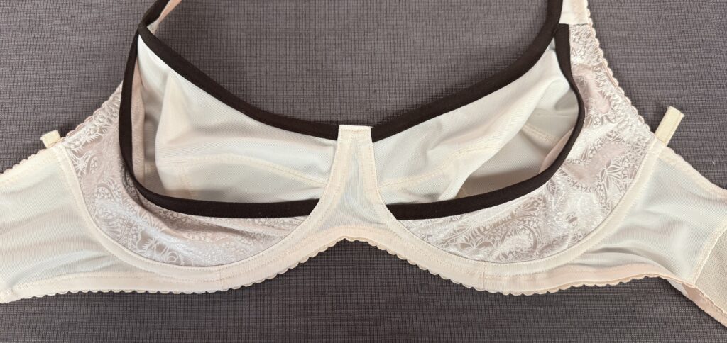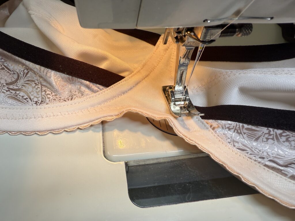 On the cup wire line, you aren’t just sewing two pieces of fabric together. You are also attaching a wire casing (called channeling, a soft, tube the wire slides into). The channeling is attached to the seam allowance around the wire line. But then we add two rows of topstitching. Huh?